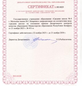 | Лицензиат | Государственное учреждение образования «Средняя школа № 4 г.Могилева имени И.С.Лазаренко», 212030,